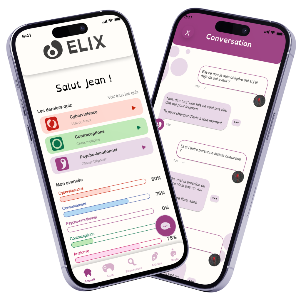 ELIX est une solution numérique de référence, accessible sur le web et mobile, dédiée aux jeunes de 11 à 15 ans. Cet espace sécurisé permet de s’informer et de tester ses connaissances sur la vie affective, relationnelle et sexuelle au moment où les interrogations sur le corps et les relations sont les plus fortes.